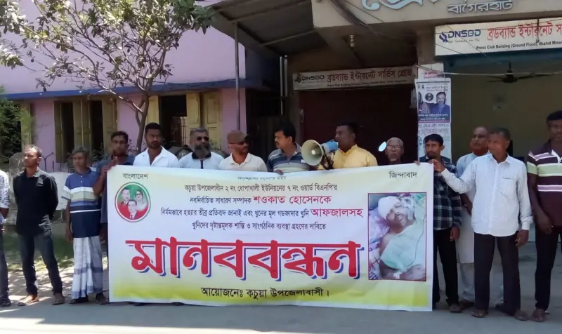 বাগেরহাটের কচুয়ায় বিএনপি নেতা শওকত হোসেনকে নৃশংসভাবে হত্যাকারী ও মূল গডফাদারদের দ্রুত গ্রেপ্তার করে আইনের আওতায় আনা সহ সাংগঠনিক ব্যবস্হা গ্রহনের দাবিতে মানববন্ধন করেছে কচুয়া উপজেলাবাসী।