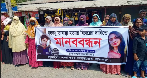মানববন্ধনে তামান্নার পরিবারের সদস্যরা বলেন, প্রায় ৯ বছর আগে প্রেমের সম্পর্ক মেনে নিয়ে চন্দনী গ্রামের আহম্মদ আলী মাস্টারের ছেলে পুলিশ সদস্য লিটন মাহমুদ (৩৩) এর সাথে পারিবারিক ভাবে তামান্নার বিয়ে হয়। বিয়ের পর থেকেই লিটন তামান্নার পরিবারের কাছে বিভিন্ন দাবি দাওয়া করতেন এবং তামান্নার বাবা লিটনকে মোটরসাইকেল, আসবাবপত্রসহ নগদ টাকা নিয়েছেন ও বিভিন্ন সময় নগদ অর্থ দাবি করে আসতেন। একটা সময় পরকীয়ায় জড়িয়ে পড়ে লিটন। সেই থেকে শুরু হয় সংসারে অশান্তি। তামান্নাকে বিভিন্ন সময় নির্যাতন করতেন তার স্বামী শশুর সহ পরিবারের সদস্যরা।