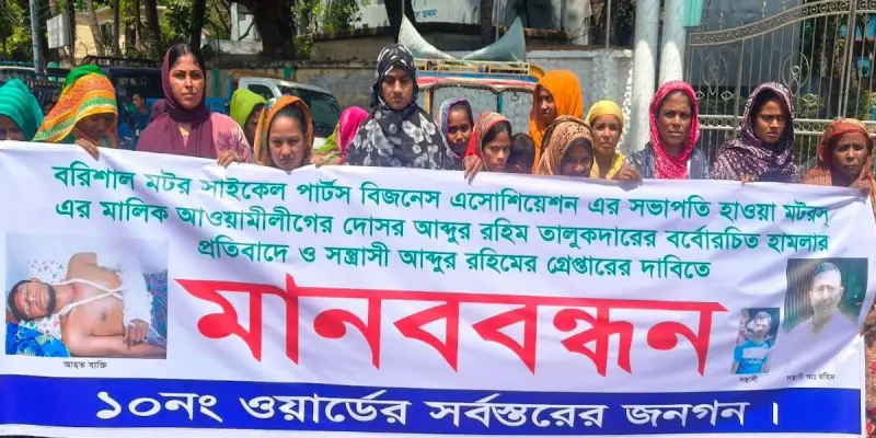 বরিশাল মটর সাইকেল পার্টস বিজনেস এ্যাসোসিয়েশনের সভাপতি ও হাওয়া মটরস মালিক এবং আওয়ামীলীগের দোসর আব্দুর রহিম তালুকদার ও তার বাহিনীর কর্তৃক পরিকল্পিত ভাবে দিনমজুর সালাম হাওলাদারকে মারধর করে হাত ভেঙ্গে দেয় ও মিথ্যা চুরি অপবাদ এবং ব্যাবসা প্রতিষ্ঠানে হামলার অভিযোগ তুলে সলামকে হয়রানী করার উদ্দ্যেসে একটি মিথ্যা মামলা দায়ের করেন রহিম। তাই সালামের বিরুদ্ধে দায়েরকৃত মিথ্যা মামলা প্রত্যাহার এবং হামলার বিচারের দাবি সহ সন্ত্রাসী রহিমকে গ্রেপ্তারের দাবিতে জানিয়ে মানববন্ধন ও বিক্ষোভ মিছিল করেছেন এলাকাবাসী।