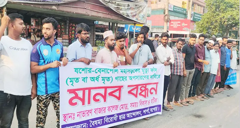 যশোরের শার্শা উপজেলা বৈষম্য বিরোধী ছাত্র আন্দোলনের উদ্যোগে যশোর-বেনাপোল মহাসড়কের দুই পাশে মৃত বা অর্ধ মৃত গাছ অপসারণের দাবিতে মানববন্ধন অনুষ্ঠিত হয়েছে।