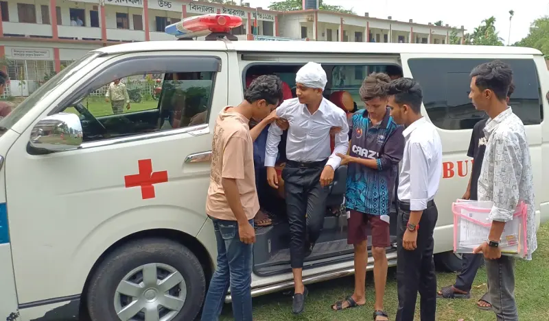 মাথায় ব্যান্ডেজ করা রিয়াদকে ধরে স্বজন ও সহপাঠীরা পৌঁছে দেন পরিক্ষার নির্ধারিত কক্ষে। মঙ্গলবার (১৫ এপ্রিল ২০২৫) এমন দৃশ্য দেখা গেছে ময়মনসিংহের ঈশ্বরগঞ্জ উপজেলার এস.এস.সি পরীক্ষা কেন্দ্র চরনিখলা উচ্চ বিদ্যালয়ে।