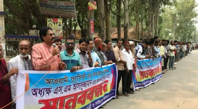 বুধবার (১৬ এপ্রিল) বেলা ১২টার দিকে উপজেলার অত্র কলেজের সামনে এই মানববন্ধন অনুষ্ঠিত হয়। সেখানে এলাকার ছাত্র-ছাত্রী সাধারণ জনগণ ও বিএনপির নেতৃবৃন্দ অংশগ্রহণ করে।