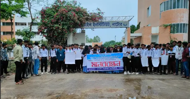 জুনিয়র ইন্সট্রাক্টর পদে ক্রাফট ইন্সট্রাক্টরদের পদোন্নতির হাইকোর্টের রিট বাতিল ও ২০২১ সালের অবৈধ নিয়োগ বাতিলসহ পলিটেকনিক শিক্ষার্থীদের যৌক্তিক ৬ দফা দাবি এবং পলিটেকনিক শিক্ষার্থীদের উপর হামলার প্রতিবাদে নাটোরে মানববন্ধন অনুষ্ঠিত হয়েছে।