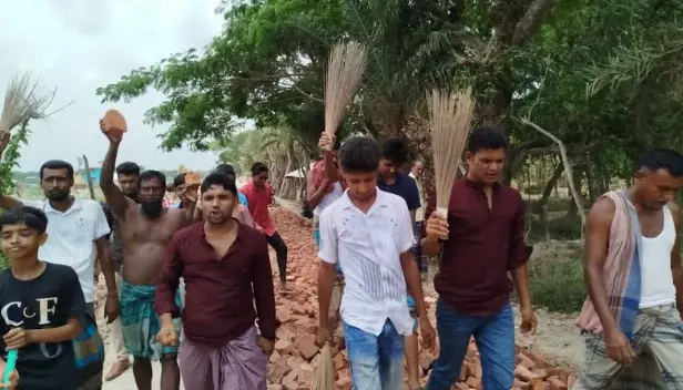 এ বিষয়ে স্থানীয় বাসিন্দা কাওসার হামিদ, রাসেল মৃধা, আলমাস খলিফা, জাহাঙ্গীর মিয়া বলেন, সড়কে একদম নিম্ন মানের ইট দিয়ে রাস্তা নির্মাণ কাজ করতে ছিলো। ব্যবহারিত ইট হাত দিয়েই ভাঙা যাচ্ছে। এ বিষয়ে উপজেলা প্রকৌশলীকে জানালে তিনি কোনো ব্যবস্থা নেয়নি। তাই আমার প্রকৌশলীর বিরুদ্ধে ঝাড়ু মিছিল দিয়ে কাজ বন্ধ করে দিয়েছি। তাঁরা আরও বলেন, 'ওই প্রকৌশলীকে ‘ম্যানেজ’ করে ঠিকাদার দায়সারাভাবে রাস্তার কাজ করতেছিলো।