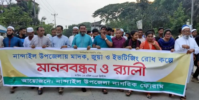 বৃহস্পতিবার (১৭ এপ্রিল) বিকাল ৫ টায় নান্দাইল উপজেলা নাগরিক ফোরামের আয়োজনে মানববন্ধন ও র্যালী অনুষ্ঠিত হয়।