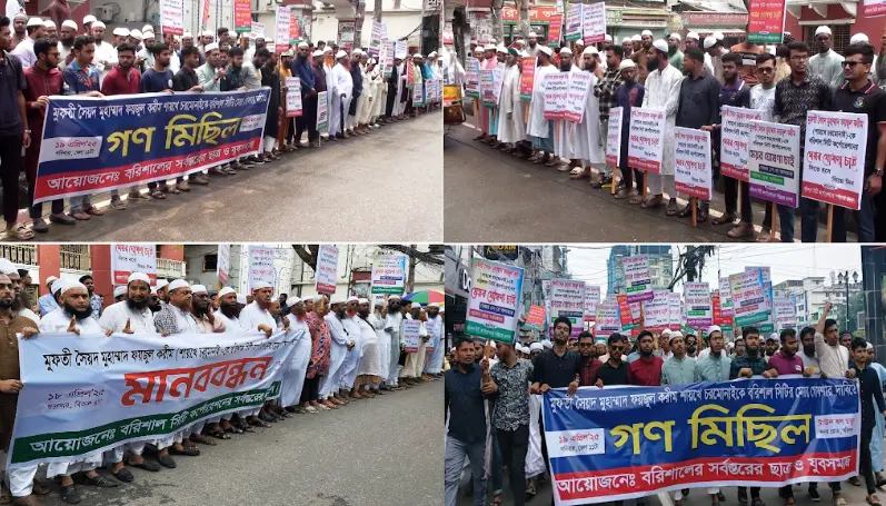 শনিবার (১৯ এপ্রিল) বেলা ১২ টায় নগরীর সদর রোডের টাউন হল চত্বরে বরিশালের সর্বস্তরের ছাত্র ও যুবসমাজের ব্যানারে মানববন্ধন ও গণ মিছিল বের করা হয়। মিছিলটি নগরীর বিভিন্ন সড়ক প্রদক্ষিন করেন। মিছিলে ছাত্র-যুবসমাজ ও ইসলামী আলেমগনরা উপস্থিত ছিলেন।