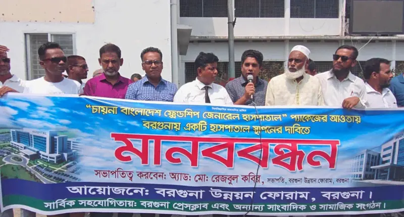 বরগুনায় চীন বাংলাদেশ ফ্রেন্ডশিপ ১০০০ শয্যা বিশিষ্ট জেনারেল হাসপাতাল স্থাপনের দাবিতে মানববন্ধন করেছে বরগুনাবাসী। মানববন্ধন শেষে হাসপাতাল বরগুনায় স্হাপনের দাবিতে বরগুনা জেলা প্রশাসক বরাবরে স্মারকলিপি প্রদান করা হয় স্বাস্থ্য উপদেষ্টা বরাবরে।