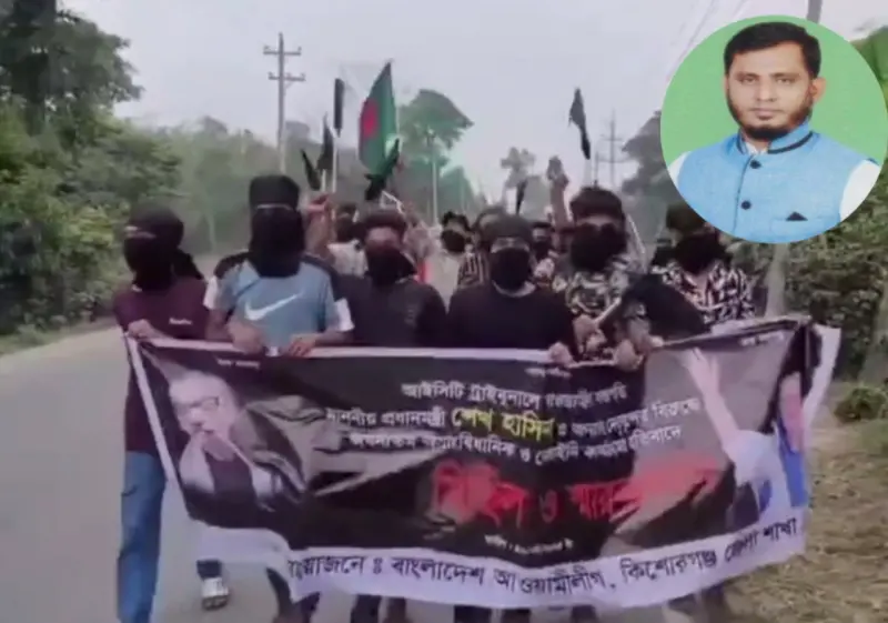 পুলিশ জানায়, গতকাল রবিবার সকালে ১৫ থেকে ২০ জন লোক মুখে কালো কাপড় বেঁধে কিশোরগঞ্জ-ভৈরব আঞ্চলিক মহাসড়কের সগড়া বিশ্বরোড এলাকায় আইসিটি ট্রাইব্যুনালে বাংলাদেশ আওয়ামী লীগের সভাপতি শেখ হাসিনা ও নেতাদের বিরুদ্ধে অসাংবিধানিক ও বেআইনি কার্যক্রমের প্রতিবাদে বাংলাদেশ আওয়ামী লীগ কিশোরগঞ্জ জেলা শাখার ব্যানারে ঝটিকা মিছিল করা হয়। এতে ওয়ার্ড যুবলীগ সভাপতি রবিন মেম্বার নেতৃত্ব দেন।