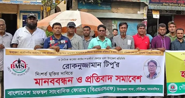 দৈনিক কালের কন্ঠের তালা উপজেলা প্রতিনিধি রোকনুজ্জামান টিপু’র মুক্তি ও তথ্য চাওয়ায় সাংবাদিককে কারাদণ্ড দেয়ার ঘটনায় তালা ইউএনও’র শাস্তির দাবিতে ময়মনসিংহের গৌরীপুরে বুধবার (২৩ এপ্রিল/২৫) মানববন্ধন, বিক্ষোভ মিছিল ও প্রতিবাদ সমাবেশ করে বাংলাদেশ মফস্বল সাংবাদিক ফোরাম গৌরীপুর উপজেলা ও গৌরীপুর সাংবাদিক ঐক্য ফোরাম।