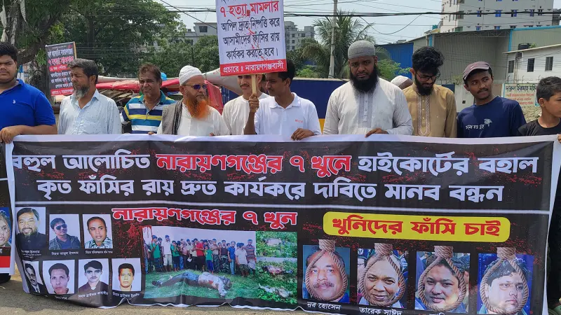 নারায়ণগঞ্জের সিদ্ধিরগঞ্জের বহুল আলোচিত ৭ খুন মামলায় হাইকোর্টের বহালকৃত ফাঁসির রায় দ্রুত কার্যকরের দাবিতে মানববন্ধন করেছে নিহতের স্বজনরা ও স্থানীয়রা।