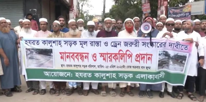 বরিশালে সড়ক সংস্কারের দাবিতে মানববন্ধন করা হয়েছে। শুক্রবার (২৫ এপ্রিল) বিকেলে নগরীর হজরত কালুশাহ সড়ক মোড়ে এই মানববন্ধন করা হয়।