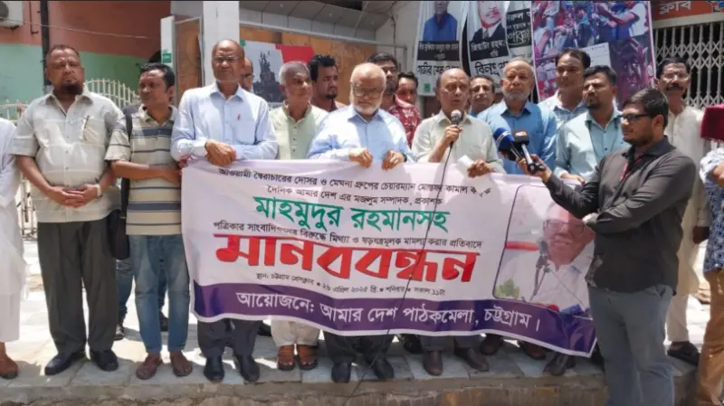 আমার দেশ পত্রিকার সম্পাদক ও প্রকাশক মাহমুদুর রহমানের বিরুদ্ধে মেঘনা গ্রুপের চেয়ারম্যান এবং ৭১ টিভির মালিক মোস্তফা কামালের দায়ের করা ‘মিথ্যা ও ষড়যন্ত্রমূলক’ মামলা প্রত্যাহারের দাবিতে চট্টগ্রাম প্রেসক্লাবের সামনে মানববন্ধন অনুষ্ঠিত হয়েছে।
