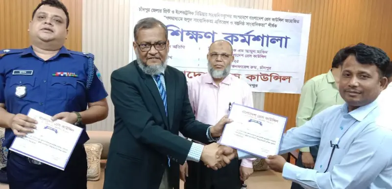 চাঁদপুরে প্রিন্ট ও ইলেকট্রনিক মিডিয়ার সাংবাদিকদের অংশগ্রহণে গণমাধ্যমে হলুদ সাংবাদিকতা প্রতিরোধ ও বস্তুনিষ্ঠ সাংবাদিকতা শীর্ষক প্রশিক্ষণ কর্মশালা অনুষ্ঠিত হয়েছে।