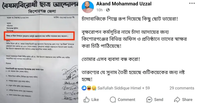 কিশোরগঞ্জ জেলায় বৈষম্যবিরোধী ছাত্র আন্দোলন শুরু থেকে প্রধান সমন্বয়ক দায়িত্ব পালন করা অভি চৌধুরী জানান, পূর্বে আওয়ামী লীগ, যুবলীগ ও ছাত্রলীগ যেভাবে চাঁদাবাজিতে জড়িত ছিলো বর্তমানে বৈষম্যবিরোধী ছাত্র আন্দোলনের তথাকথিত কিছু সমন্বয়ক এই ব্যানারটাকে ব্যবহার করে বিভিন্ন অফিস-দপ্তরে চাঁদাবাজি করছে। বিষয়টি জেনে আমি নিজেও ফেসবুকে এই পোস্ট দিয়েছি। এই চাঁদাবাজির প্রতিবাদ জানাই।