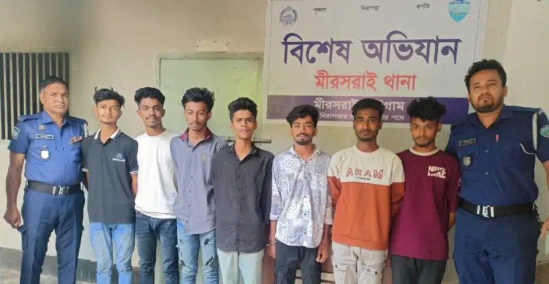 আটককৃতরা হলেন মো. ওয়াছি আলম প্রঃ শান্ত (১৯), মো. সবুজ (২০), মো. আরিফুল ইসলাম, (১৯), মো. সোহেল রানা (২০), মো. রিয়াজ হোসেন (১৯), তারিকুল ইসলাম রিফাত (১৯) এবং মো. হৃদয় (১৯)। তাদের সকলের বাড়ি মিরসরাই উপজেলার বিভিন্ন এলাকায়।