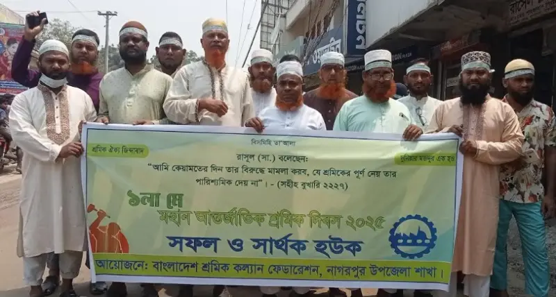 'শ্রমিকের অধিকার প্রতিষ্ঠায় ইসলামী আদর্শই পথ' টাঙ্গাইলের নাগরপুরে মহান মে দিবস উপলক্ষে বাংলাদেশ জামায়াতে ইসলামীর সহযোগী সংগঠন বাংলাদেশ শ্রমিক কল্যাণ ফেডারেশন, নাগরপুর উপজেলা শাখা-এর উদ্যোগে এক বর্ণাঢ্য র্যালি ও সংক্ষিপ্ত আলোচনা সভার আয়োজন করা হয়।