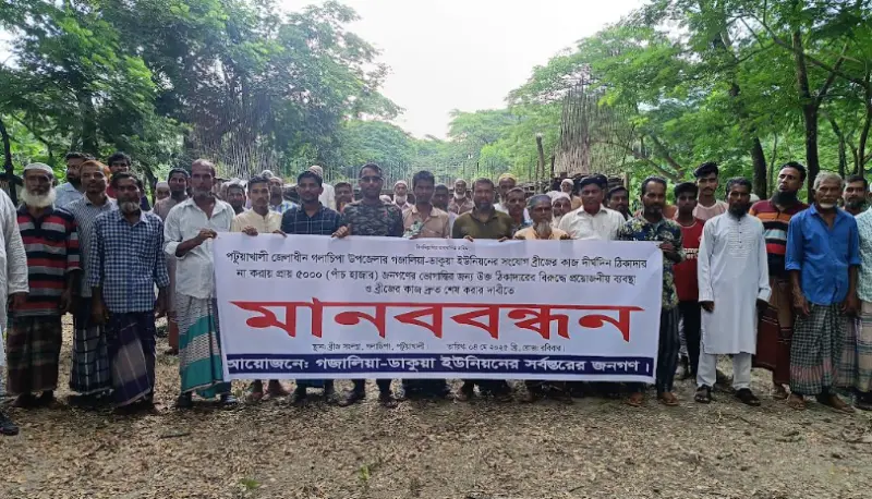 গলাচিপা উপজেলার ডাকুয়া-গজালিয়া ইউনিয়নের সংযোগ খালের ওপর নির্মাণাধীন ব্রিজের কাজ দীর্ঘদিন ধরে বন্ধ থাকায় চরম দুর্ভোগে পড়েছেন এলাকাবাসী। দীর্ঘ প্রতীক্ষার পরও ব্রিজ নির্মাণে অগ্রগতি না হওয়ায় ক্ষোভে ফেটে পড়েছেন স্থানীয়রা। এরই প্রতিবাদে ও দ্রুত কাজ সম্পন্নের দাবিতে মানববন্ধন কর্মসূচি পালন করেছেন তারা।
