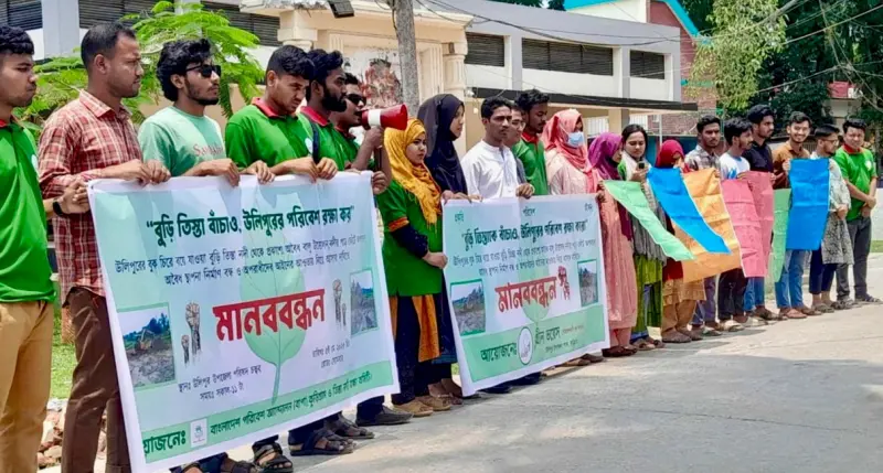 কুড়িগ্রামের উলিপুর পৌরশহরে প্রকাশ্যে প্রশাসনের নাকের ডগায় বুড়ি তিস্তা নদী থেকে অবৈধ বালু উত্তোলন, নদীর পাড় কেটে অপসারণ, অবৈধ স্থাপনা নির্মাণ বন্ধ ও অপরাধীদের আইনের আওতায় আনার দাবিতে মানববন্ধন অনুষ্ঠিত হয়েছে।