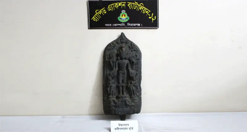গুড়ার শেরপুরে মূল্যবান বিষ্ণুর কষ্টি পাথরের মূর্তি উদ্ধার করেছে সিরাজগঞ্জ র্যাব-১২ সদস্যরা। এসময় মূতি পাচারকারী ৩ সদস্যকে আটক করা হয়েছে। মূর্তিটির উচ্চতা ১৭ ইঞ্চি, প্রস্থ ১২ ইঞ্চি এবং ওজন ২৯ কেজি।