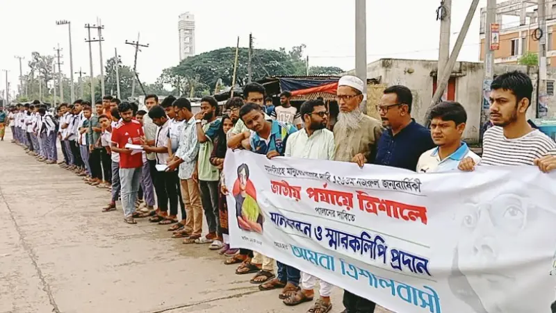 পূর্ব ঘোষিত কর্মসূচীর অংশ হিসেবে সোমবার (১২ মে) বেলা সাড়ে ১১টার দিকে ঢাকা-ময়মনসিংহ মহাসড়কের নজরুল অডিটরিয়মের সামনে একত্রিত হয়ে মহাসড়কে মানববন্ধন করে। ঘন্টাব্যাপী মানবন্ধন শেষে একটি বিক্ষোভ মিছিল মহাসড়ক থেকে শুরু হয়ে পৌর শহরের বিভিন্ন সড়ক প্রদক্ষিন করে উপজেলা নির্বাহী অফিসারের কার্যালয়ের সামনে এসে শেষ হয়।