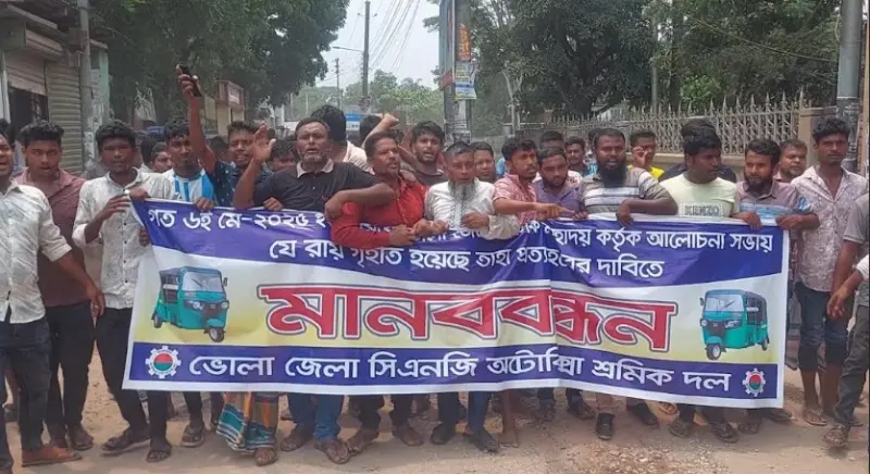 ভোলায় সিএনজি চালিত অটোরিকশা মালিক ও চালকদের উপর জেলা প্রশাসনের দেওয়া শর্ত শিথিলের দাবিতে মানববন্ধন ও বিক্ষোভ মিছিল করেছে জেলা সিএনজি অটোরিকশা চালক ও শ্রমিকরা।