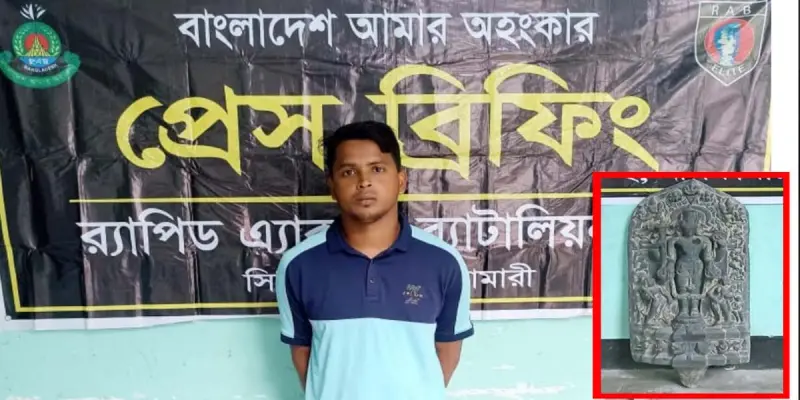ভারতে পাচারের উদ্দেশ্যে শ্বশুরবাড়িতে লুকিয়ে রাখা কষ্টিপাথরের বিষ্ণু মূর্তিসহ আবু বক্কর ছিদ্দীক নামে এক যুবককে গ্রেফতার করেছে র্যাব।