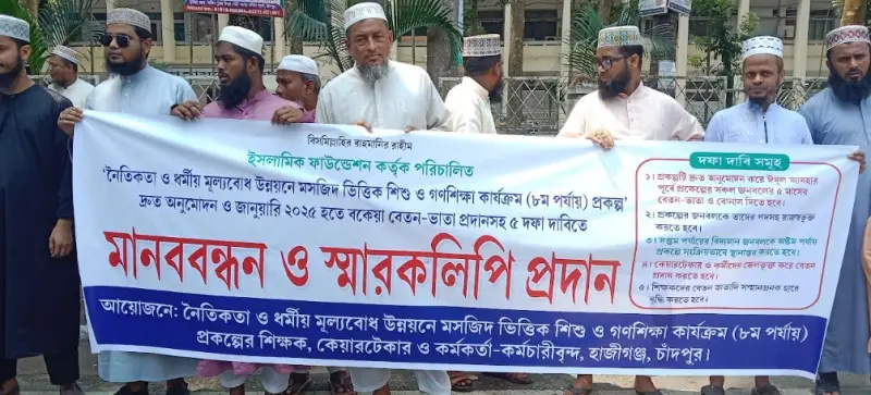 চাঁদপুরে গণশিক্ষা প্রকল্পের শিক্ষক কর্মচারীদের ৫ দফা দাবিতে মানববন্ধন অনুষ্ঠিত হয়েছে।