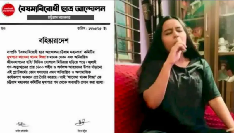 ‘বৈষম্যবিরোধী ছাত্র আন্দোলন, চট্টগ্রাম মহানগর’ কমিটির মুখপাত্র ফাতেমা খানম লিজাকে দায়িত্ব থেকে অব্যাহতি দেওয়া হয়েছে। তার মাদক সেবন ও অনিয়ন্ত্রিত জীবনযাপনের ছবি-ভিডিও ভাইরাল হওয়ায় এমন সিদ্ধান্ত নিয়েছে সংগঠনটি।