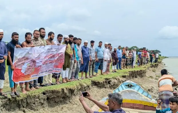 পটুয়াখালীর বাউফল উপজেলায় নদী ভাঙন রোধে মানববন্ধন করেছে নাজিরপুর ইউনিয়নবাসী।