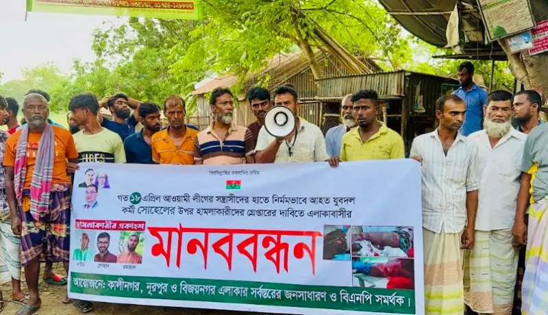 নাটোরের সিংড়ায় সন্ত্রাসীদের হাতে নির্মমভাবে আহত যুবদল কর্মী সোহেলের উপর হামলাকারীদের গ্রেপ্তারের দাবিতে মানববন্ধন করেছে কয়েকটি গ্রামের শতাধিক মানুষ।