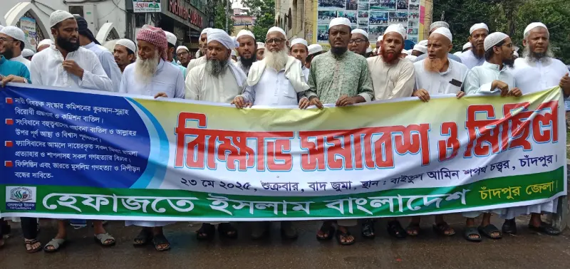 নারী সংস্কার কমিশনের কুরআন সুন্নাহ বিরোধী প্রস্তাবনা বিষয়সহ চার দফা দাবি আদায়ের লক্ষ্যে চাঁদপুরে বিক্ষোভ মিছিল ও সমাবেশ করেছে হেফাজতের ইসলাম চাঁদপুর জেলা শাখা।