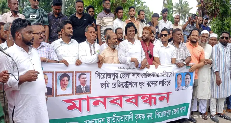 পিরোজপুর জেলা সাব-রেজিস্টার অফিসের জমি রেজিস্ট্রেশনে ঘুষ ও কৃষি অফিসের কর্মকর্তাদের দূর্নীতি বন্ধের দাবিতে মানববন্ধন অনুষ্ঠিত হয়েছে।