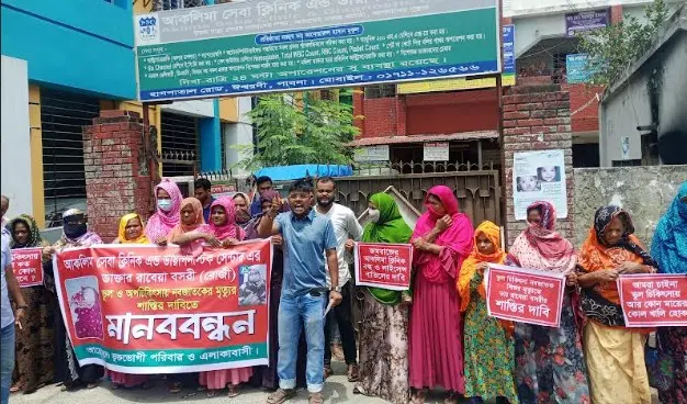 রোববার (২৫ মে) দুপুরে পাবনা ঈশ্বরদীর উপজেলা স্বাস্থ্য কমপ্লেক্স সংলগ্ন আকলিমা সেবা ক্লিনিক এন্ড ডায়াগনস্টিক সেন্টারের সামনে এসব কর্মসূচি পালন করেন ভুক্তভোগী পরিবার, স্বজন ও এলাকাবাসী। এই সময় ভূক্তভোগী পরিবারের পক্ষ থেকে ক্লিনিকের আবাসিক চিকিৎসক রাবেয়া বসরী রোজির শাস্তি দাবী করেন। একইসঙ্গে মানুষ হত্যা করার কসাইখানা উল্লেখ করে আকলিমা সেবা ক্লিনিক এন্ড ডায়াগনস্টিক সেন্টার বন্ধের দাবি জানান তারা।