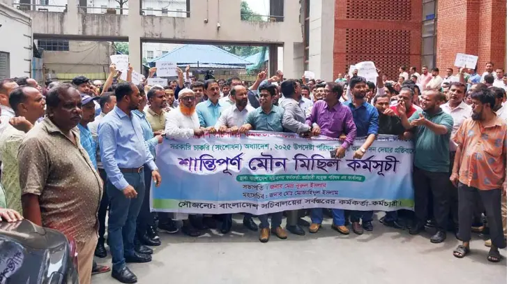 ‘সরকারি চাকরি (সংশোধন) অধ্যাদেশ, ২০২৫’ অনুমোদনের প্রতিবাদে সচিবালয়ের ভেতরে গতকাল রোববার দ্বিতীয় দিনের মতো বিক্ষোভ-মিছিল করেন বিভিন্ন মন্ত্রণালয় ও বিভাগের কর্মচারীরা। তারা এই অধ্যাদেশকে ‘নিবর্তনমূলক ও কালাকানুন’ আখ্যায়িত করে তা প্রত্যাহারের দাবি জানিয়েছেন। তা না হলে আন্দোলন চালিয়ে যাওয়ারও ঘোষণা দিয়েছেন তারা।