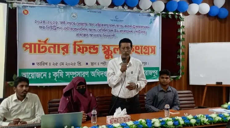 পিরোজপুরের নাজিরপুরে কৃষি সম্প্রসারণ অধিদপ্তরের আয়োজনে পার্টনার ফিল্ড স্কুল কংগ্রেস অনুষ্ঠিত হয়েছে। এগ্রিকালচার অ্যান্ড রুরাল ট্রান্সফরমেশন ফর নিউট্রিশন এন্টারপ্রেনারশিপ অ্যান্ড রেসিলিয়েন্স ইন বাংলাদেশ (পার্টনার) প্রকল্পের আওতায় দিনব্যাপী পার্টনার ফিল্ড স্কুল কংগ্রেসে প্রধান অতিথি হিসেবে বক্তব্য রাখেন পিরোজপুর জেলা কৃষি অফিসের উপ-পরিচালক সাইফুল ইসলাম।