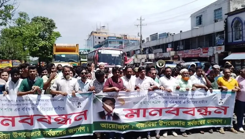 মুন্সীগঞ্জের গজারিয়া উপজেলায় সহকারী কমিশনার (ভূমি) কর্মকর্তা মামুন শরীফের অনিয়ম, দুর্নীতি ও ঘুষখোর কর্মকর্তার অপসারণ দাবি করে ঢাকা-চট্টগ্রাম মহাসড়কে বিক্ষোভ মিছিল ও মানববন্ধন কর্মসূচি পালন করেছে গজারিয়া উপজেলাবাসী।