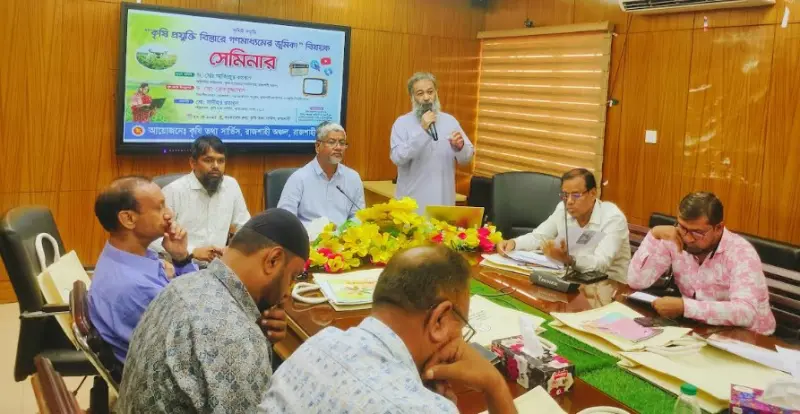 মঙ্গলবার (২৭ মে) সকালে রাজশাহী কৃষি তথ্য সার্ভিসের আয়োজনে অনুষ্ঠিত হয় একটি গুরুত্বপূর্ণ সেমিনার, যেখানে কৃষির ভবিষ্যৎ উন্নয়নে প্রযুক্তির পাশাপাশি গণমাধ্যমের যৌথ ভূমিকার ওপর জোর দেওয়া হয়।