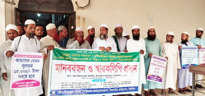 বকেয়া বেতন ও ঈদ বোনাসের দাবিতে রাজধানীর আগারগাঁওয়ে ইসলামিক ফাউন্ডেশন কার্যালয়ের সামনে মানববন্ধন করেছে মডেল কেয়ারটেকার কল্যাণ পরিষদ।