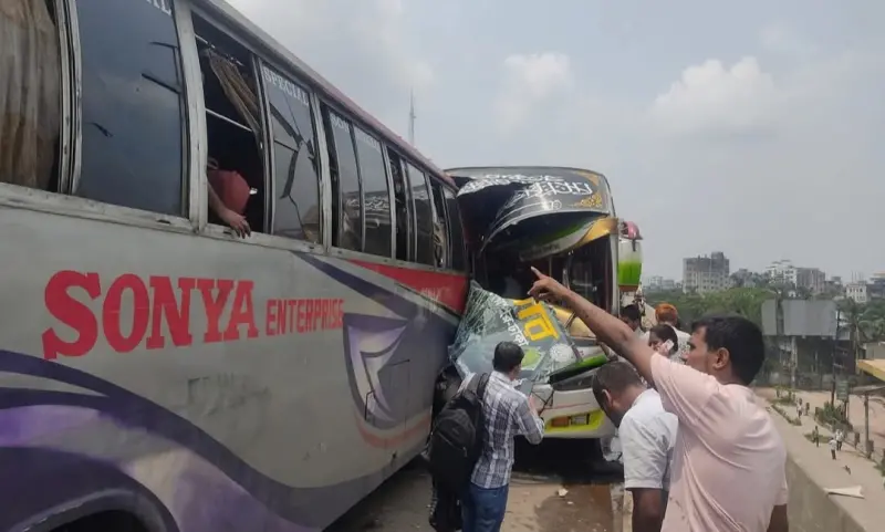 বৃহস্পতিবার (০৫ জুন) দুপুরে চেরাগ আলী এলাকায় আফতাব সিএনজি স্টেশনের সংলগ্ন ফ্লাইওভারে এ দুর্ঘটনা ঘটে। এতে উভয়বাসের চালক গুরুতর আহত হন এবং যানচলাচলে ধীরগতি দেখা দেয় পুরো মহাসড়জুড়ে।