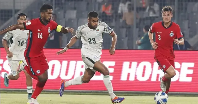 এশিয়ান কাপ বাছাই পর্বের ম্যাচে সিঙ্গাপুরের কাছে ২-১ গোলে হেরেছে বাংলাদেশ। তবে ২-০ গোলে পিছিয়ে থাকা ম্যাচে দেশের হয়ে ব্যবধান কমান রাকিব হোসেন। দ্বিতীয়ার্ধের শেষ মুহূর্তে বেশ কয়েকটি সুযোগ সৃষ্টি করেছিল স্বাগতিকরা।