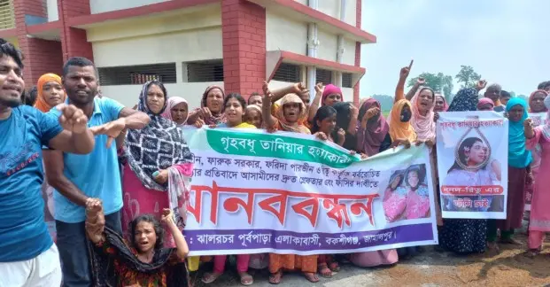 জামালপুরের বকশীগঞ্জে গৃহবধূ তানিয়ার মৃত্যুর রহস্য উদঘাটন ও বিচারের দাবিতে মানববন্ধন করেছে এলাকাবাসী।