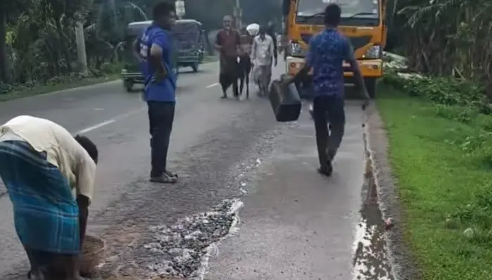 ওই স্থানে দেখা যায় সড়ক ও জনপথের একটি ট্রাক দাঁড়ানো রয়েছে। আর সেখান থেকে ভেজা বালু ও তরল বিটুমিন নিয়ে আসছেন তিনজন শ্রমিক। আর সড়কের গর্ত ও ফাটলে পাথর বসিয়ে তা প্রথমে হাতে ও পরে পায়ে চাপ দিচ্ছেন একজন। কাছে গিয়ে জানতে চাইলে তিনি নিজেকে ওই ট্রাকের চালক আল-আমীন বলে পরিচয় দেন।