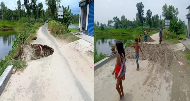 জামালপুরের দেওয়ানগঞ্জে টানা কয়েকদিনের বৃষ্টিতে মিতালী থেকে সানন্দবাড়ী যাওয়ার পথে মিতালী বাজারের উত্তর পাশে মেইন রাস্তা ধসে গিয়ে সড়কের বেহাল অবস্থা সৃষ্টি হয়েছে।