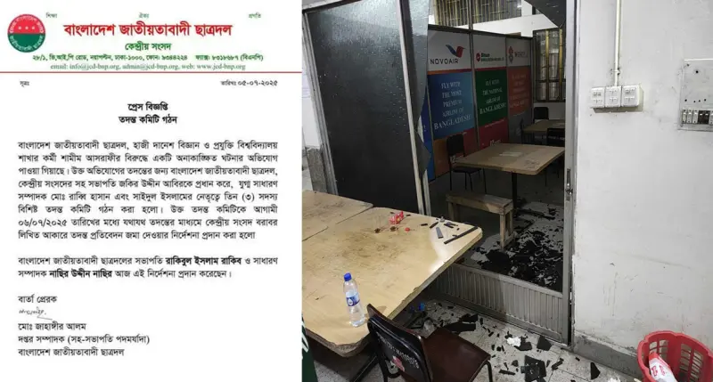 সাংবাদিক সমিতির অফিস ভাঙচুরের ৪ দিন পর বাংলাদেশ জাতীয়তাবাদী ছাত্রদল তাদের ফেসবুক পেজে তদন্ত কমিটি গঠনের প্রেস বিজ্ঞপ্তি প্রকাশ করে। প্রেস বিজ্ঞপ্তিতে বলা হয়, বাংলাদেশ জাতীয়তাবাদী ছাত্রদল, হাজী দানেশ বিজ্ঞান ও প্রযুক্তি বিশ্ববিদ্যালয় শাখার কর্মী শামীম আশরাফীর বিরুদ্ধে একটি অনাকাঙ্ক্ষিত ঘটনার অভিযোগ পাওয়া গিয়েছে। উক্ত অভিযোগের তদন্তের জন্য বাংলাদেশ জাতীয়তাবাদী ছাত্রদল, কেন্দ্রীয় সংসদের সহ-সভাপতি জকির উদ্দিন আবিরকে প্রধান করে, যুগ্ম সাধারণ সম্পাদক মো. রাব্বী হাসান এবং সাইদুল ইসলামের নেতৃত্বে ৩ (৩) সদস্য বিশিষ্ট তদন্ত কমিটি গঠন করা হলো। উক্ত তদন্ত কমিটিকে আগামী ০৬/০৭/২০২৫ তারিখের মধ্যে যথাযথ তদন্তের মাধ্যমে কেন্দ্রীয় সংসদ বরাবর লিখিত প্রতিবেদন জমা দেওয়ার নির্দেশনা প্রদান করা হলো। বাংলাদেশ জাতীয়তাবাদী ছাত্রদলের সভাপতি রাকিবুল ইসলাম রাকিব ও সাধারণ সম্পাদক নাছির উদ্দীন নাছির আজ এই নির্দেশনা প্রদান করেছেন।