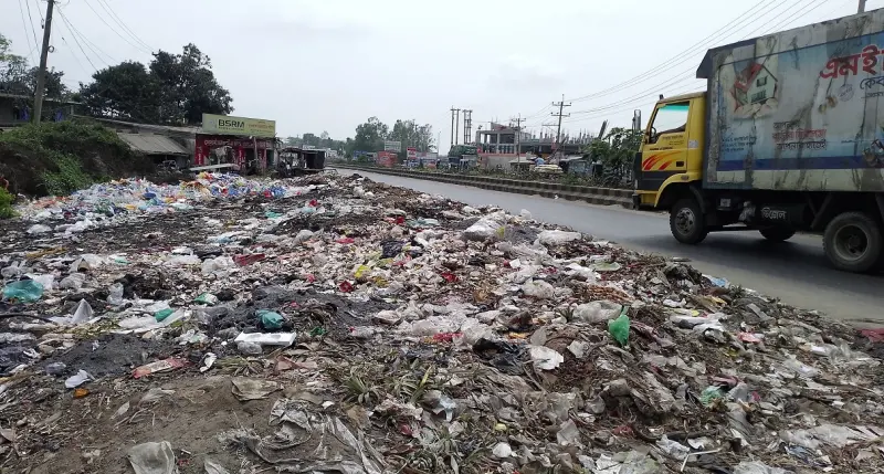 বাজারের বিভিন্ন দোকান ও ভ্রাম্যমাণ ব্যবসায়ীরা প্রতিদিন বিক্রয় শেষে সড়কের পাশেই ফেলে যাচ্ছেন কাঁচামালের আবর্জনা। নির্দিষ্ট কোনো বর্জ্য নিষ্পত্তির ব্যবস্থা না থাকায় দিন দিন ময়লার স্তূপ বেড়েই চলেছে।