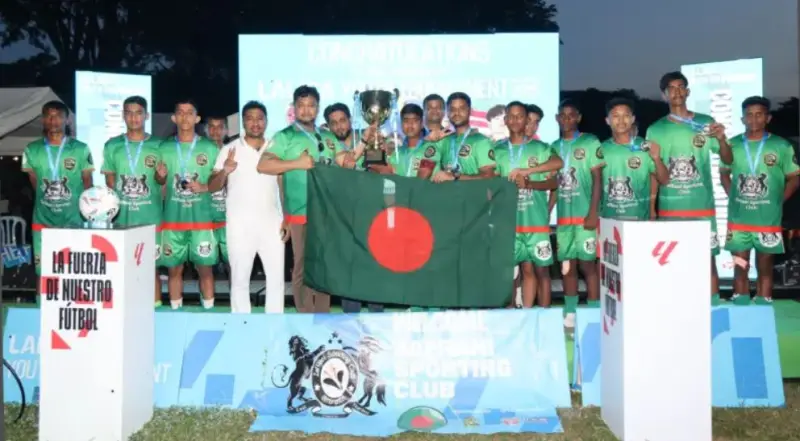 বাংলাদেশের ক্রীড়াঙ্গনে রচিত হলো এক নতুন ইতিহাস। মালয়েশিয়ায় অনুষ্ঠিত লা-লিগা ইয়ুথ টুর্নামেন্ট ২০২৫-এ স্পেন, পাকিস্তান ও মালয়েশিয়াকে হারিয়ে অপরাজিত ফাইনালিস্ট হয়ে আজ শক্তিশালী মালয়েশিয়া দলের সঙ্গে ফাইনাল অনুষ্ঠিত হয়। টান টান উত্তেজনাপূর্ণ ম্যাচটিতে খেলার ৩৫ মিনিটে বাংলাদেশের বিপক্ষে গোল দিয়ে চ্যাম্পিয়ন হয় মালয়েশিয়া এবং প্রথমবারের মতো অংশগ্রহণ করেই রানার্স আপ হয় বাংলাদেশ।