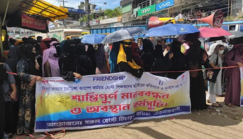 কক্সবাজারের উখিয়ায় রোহিঙ্গা ক্যাম্প থেকে চাকরিচ্যুত শিক্ষকরা সড়ক অবরোধ করে আন্দোলনে নেমেছেন। দীর্ঘ ৪ ঘণ্টা ধরে কক্সবাজার-টেকনাফের প্রধান সড়ক অচল করে রেখেছেন আন্দোলনকারীরা। দাবি আদায় না হওয়া পর্যন্ত সড়ক অবরোধ কর্মসূচি চালিয়ে যাওয়ার ঘোষণা দিয়েছেন তারা।
