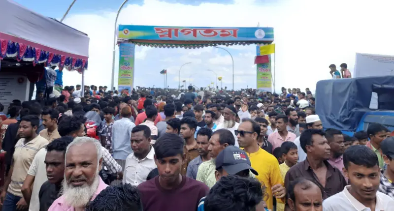 ফলক উন্মোচন মঞ্চসহ সমগ্র এলাকায় উচ্ছাসিত হাজারো ভীরের পা ফেলানোর জায়গা নেই। মূলত: ভোগান্তির নৌপথ ছাড়া স্বাভাবিক যোগাযোগ বিচ্ছিন্ন মানুষগুলো প্রশস্ত সড়কসহ দীর্ঘ নান্দনিক সেতু পেয়ে বাঁধ ভাঙা আনন্দ তাদের।