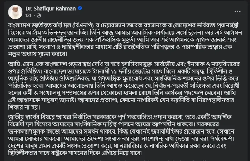 বাংলাদেশ জাতীয়তাবাদী দলের (বিএনপি) চেয়ারম্যান তারেক রহমানকে বাংলাদেশের ভবিষ্যৎ প্রধানমন্ত্রী হিসেবে অভিনন্দন জানিয়েছেন জামায়াতে ইসলামীর আমির ডা. শফিকুর রহমান। ত্রয়োদশ জাতীয় সংসদ নির্বাচনে বিএনপির নেতৃত্বাধীন জোট নিরঙ্কুশ জয়ের পর জামায়াতে ইসলামীর আমির ডা. শফিকুর রহমানের বাসায় গিয়ে সৌজন্য সাক্ষাৎ করেছেন দলটির চেয়ারম্যান তারেক রহমান। রোববার (১৫ ফেব্রুয়ারি) এ সাক্ষাতের পর ফেসবুকে নিজের ভেরিফায়েড পেজে একটি পোস্ট দেন জামায়াতে ইসলামীর আমির।