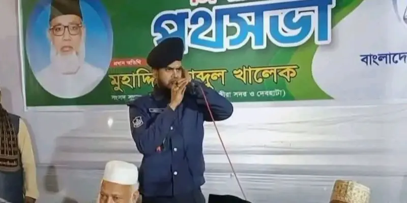 সামাজিক যোগাযোগমাধ্যমে ছড়িয়ে পড়া ভিডিওতে দেখা যায়, সাতক্ষীরা–২ আসনে জামায়াতে ইসলামীর মনোনীত প্রার্থী মুহাদ্দিস আব্দুল খালেকের একটি নির্বাচনী পথসভায় পুলিশের পোশাক পরিহিত অবস্থায় ওই পুলিশ সদস্য জামায়াতের স্লোগান সংবলিত একটি গান পরিবেশন করছেন।